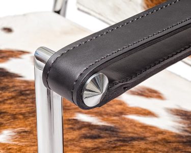 Materials: Upholstered armchair with tubular frame. Chrome-plated or lacquered. Seat and back in hair-on-hide; armrests in hide. Natural hide colors come in combinations of black, white, and/or brown. Color combination and representation will vary with each hide.