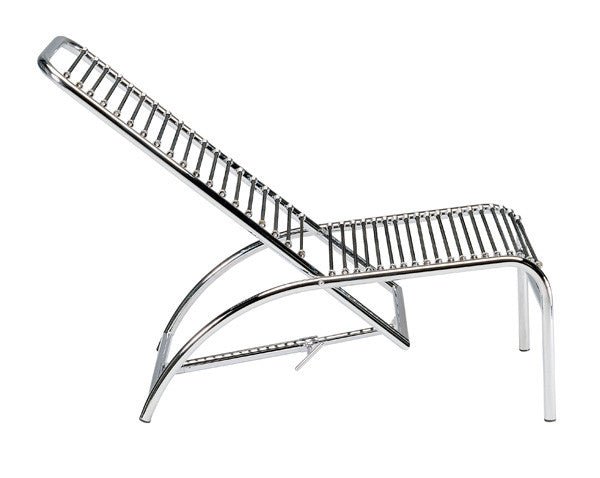 Material: Chaise in polished chrome plated tubular steel. Seat, back and arms in black elastic cords.